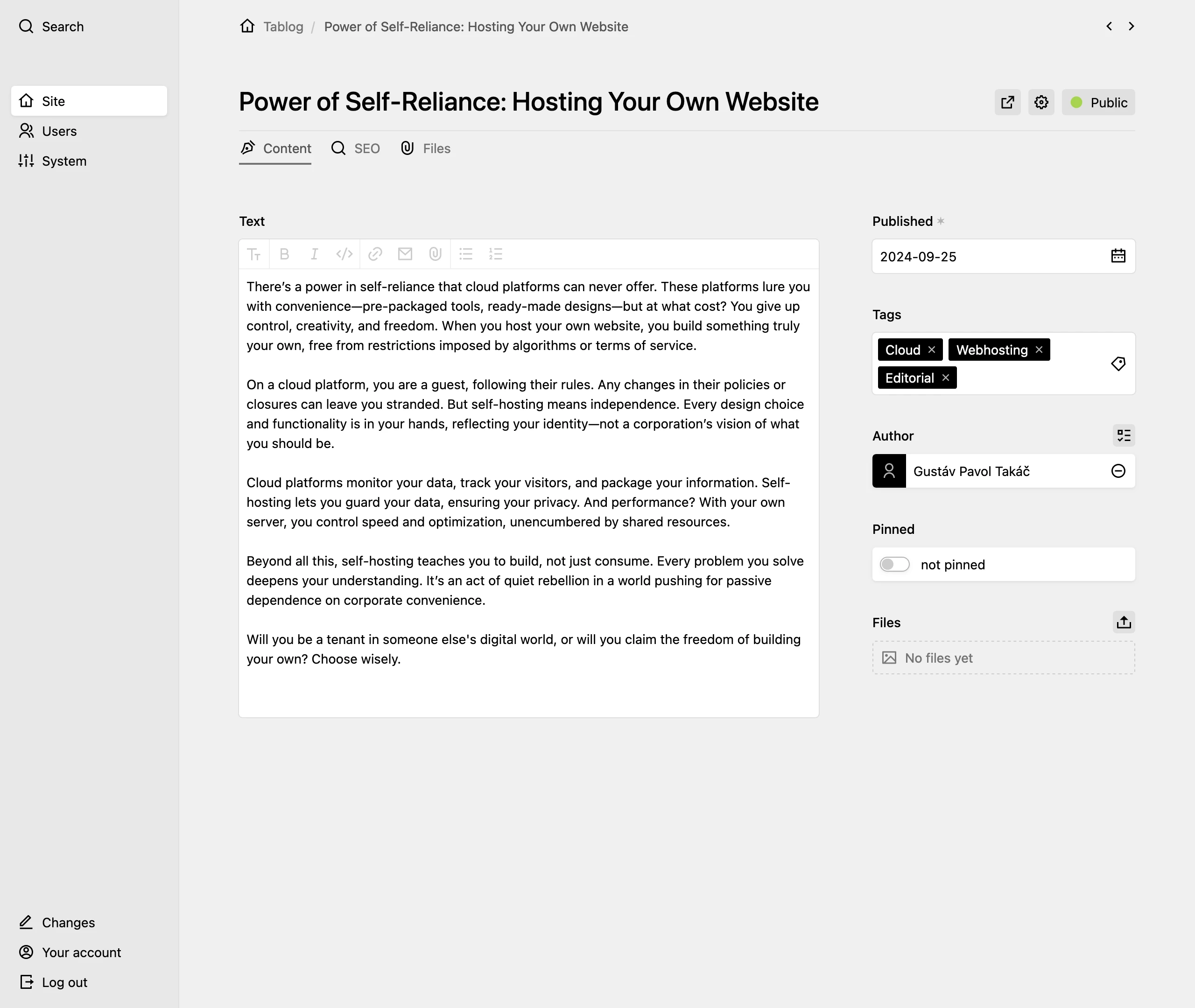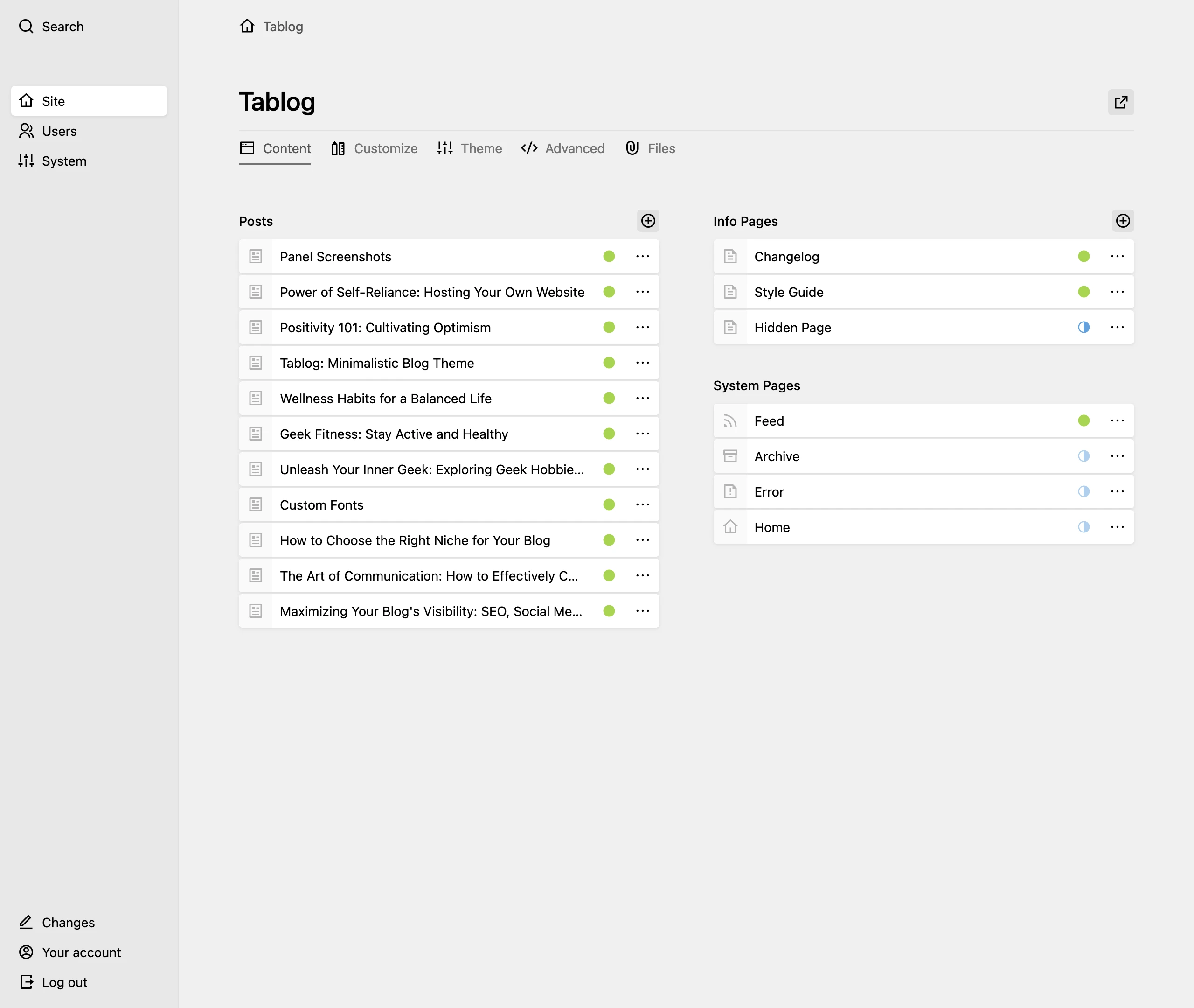 Take a peek inside Tablog's Kirby panel—a streamlined, intuitive interface for effortless blog management.